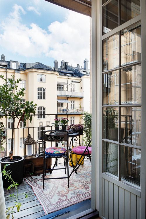 Bạn có thể làm ban công trở nên sống động hơn với một tấm thảm hoa văn với họa tiết bạn thích. Hãy lựa chọn chắc chắn một cái, bởi đó sẽ là nơi để bạn sắp đặt những cái khác lên đó.