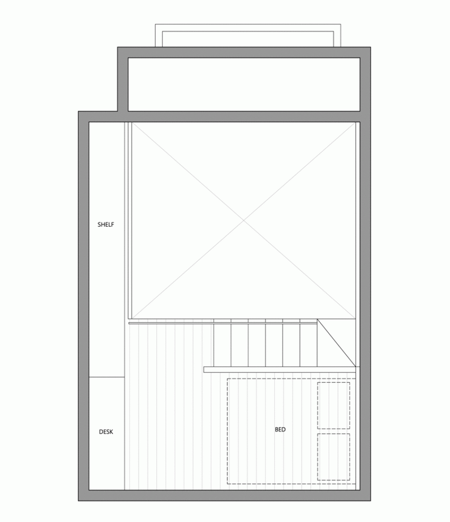 Bên dưới là tủ quần áo và các ô kệ vuông để sách ở bên trên cho phép cô chủ dễ dàng lấy đồ mỗi ngày, còn các ô tủ bên trên, bằng cách sử dụng thang trượt có thể dễ dàng lấy sách hay các đồ khác khi cần thiết.